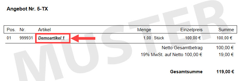 Auch bei den Artikeln, welche Sie als Belegpositionen eingesetzt haben, finden Sie einen entsprechenden Formatierungsbereich. Auf diese Weise können Sie innerhalb eines Beleges die Positionsdarstellung individuell und für Ihren Kunden übersichtlich gestalten.