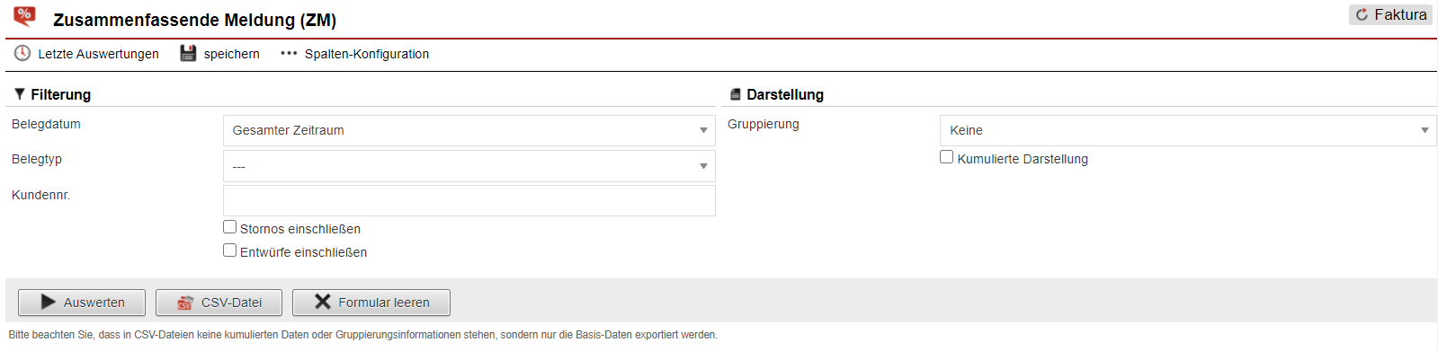 Darüber hinaus können Sie sich einen Report zur Zusammenfassenden Meldung über Ihren Statistikbereich erstellen (Hauptmenüleiste, Button "Statistik", "Zusammenfassende Meldung (ZM)"). Hier haben Sie die Möglichkeit, nach Beleg und Kundennummer zu filtern.