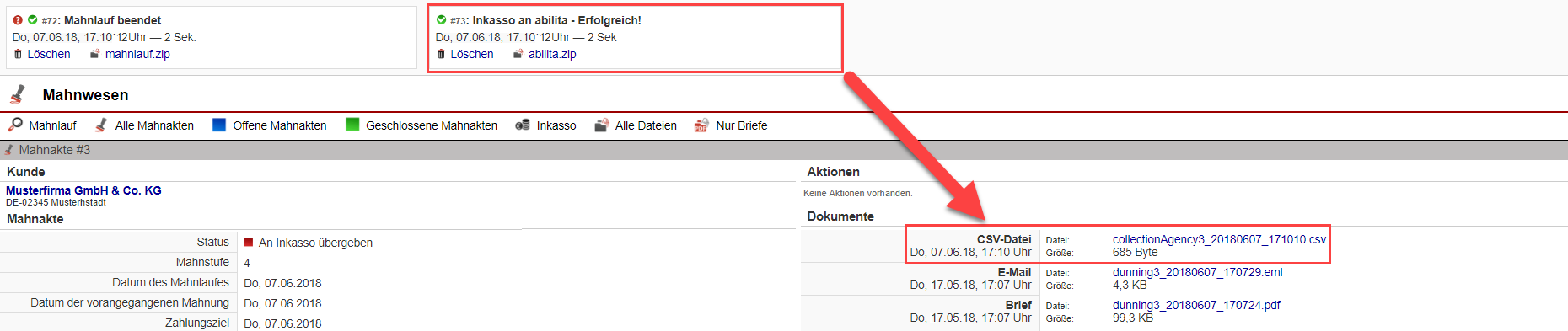 Zum Nachvollziehen des Übertragungsvorgangs sehen Sie in der Mahnakte des Kunden, welcher zum Inkassofall wurde, nach dem durchgeführten Mahnlauf einen Vermerk, dass die überfälligen Belege automatisch im Hintergrund an abilita übermittelt wurden.
