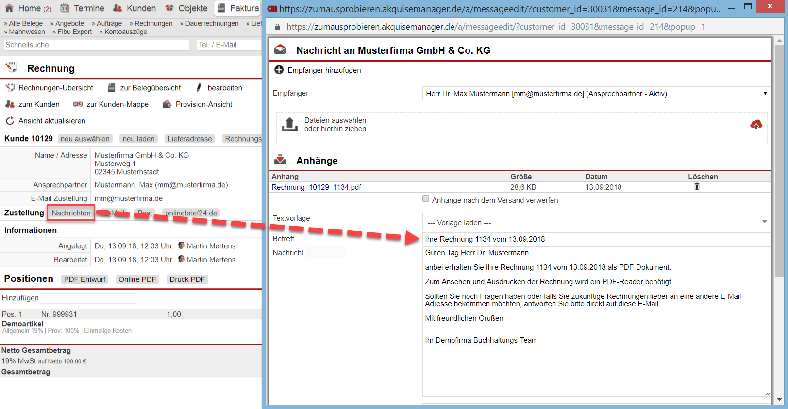 Klicken Sie einfach für den Versand eines Belegs in seiner Erstellungsmaske auf "Nachrichten" und das E-Mail-Fenster wird für Sie direkt mit dem zum Belegtyp passenden Text geöffnet. Der Beleg selbst befindet sich wie gewohnt als PDF-Datei im Anhang der Nachricht. Natürlich kann, falls nötig, der Wortlaut jederzeit abgeändert oder eine komplett andere Textvorlage aus dem entsprechenden Drop-Down-Menü gewählt werden.